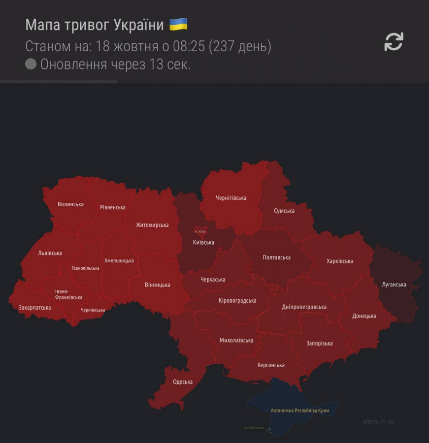 Додамо, що повітряна тривога зараз триває у всіх областях України, окрім тимчасово окупованого Криму.