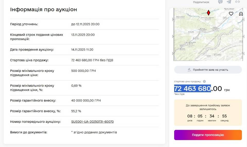 Новий аукціон відбудеться 14 листопада. Дозвіл надається строком на 20 років.
