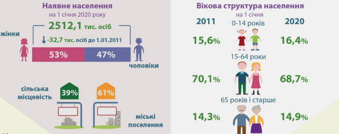 Отже, у Львівській області на 1 січня 2020 року (за оцінкою) проживало 2512,1 тис. осіб, що становило 6% від загальної кількості населення в Україні. Серед них у міських поселеннях мешкало 61% населення області, у сільській місцевості – 39%. Порівняно з початком 2011 року кількість населення скоротилась на 32,7 тис. осіб, або на 1,3%.