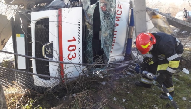 Повідомляється, що внаслідок зіткнення з вантажівкою автомобіль швидкої медичної допомоги Peugeot Boxer перекинувся.