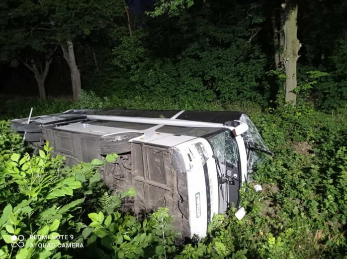 Автобус перекинувся у кювет. На момент ДТП в автобусі перебувало 40 людей. Всі громадяни України. Рятувальники вивели з автобуса 10 пасажирів та за допомогою спецінструмента деблокували 1 людину, що була затиснута між сидіннями.