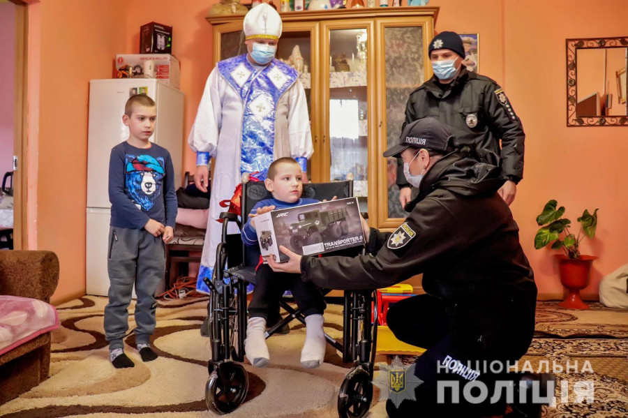 Поліцейські влаштували для Стаса таку омріяну ним зустріч. Разом із «Миколаєм» передали хлопчикові та двом його меншим братикам подарунки – не лише інвалідний візок, а й зимовий одяг, іграшки та купу смаколиків.