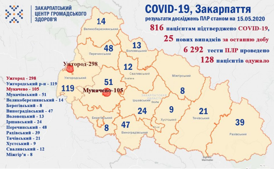Загалом по області станом на 15 травня 2020 року 816 хворим встановлено діагноз COVID-19. З них 189 – медичні працівники та 50 - діти. Проведено 6 292 досліджень на полімеразну ланцюгову реакцію.