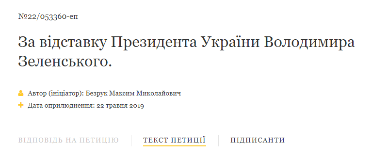 На офіційному сайті Президента України ( Офіційне інтернет-представництво Президента України) у розділі "Електронні петиції" зареєстровано петицію "За відставку Президента України Володимира Зеленського".