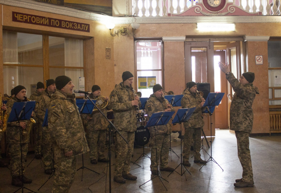 Зважаючи на дощову погоду оркестр розташувався не на платформі, як робили це раніше, а безпосереднє у приміщенні вокзалу.