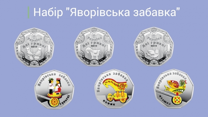 Нацбанк запустить в обіг набір пам’ятних монет “Яворівська забавка”. До набору входять три срібні монети номіналом у 2 грн, на яких зображені пташка, коник та гультяї.