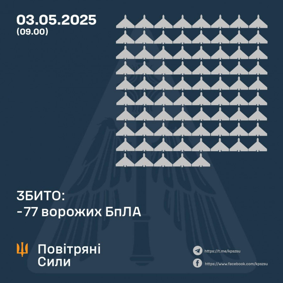 У ніч на 3 травня противник атакував двома балістичними ракетами Іскандер-М та 183 ударними БпЛА та безпілотниками-імітаторами інших типів, з них вдалося збити 77, ще 73 визнані "локаційно втраченими".