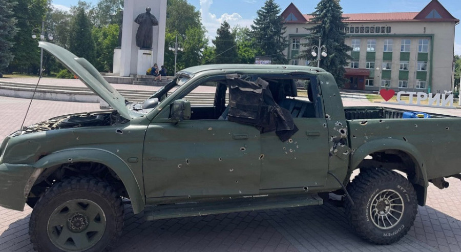 У центрі міста Стрий, що на Львівщині, встановили мовчазну інсталяцію – простріляний автомобіль з передової. Ця інсталяція покликана нагадати жителям міста про те, що в країні триває повномасштабна війна
