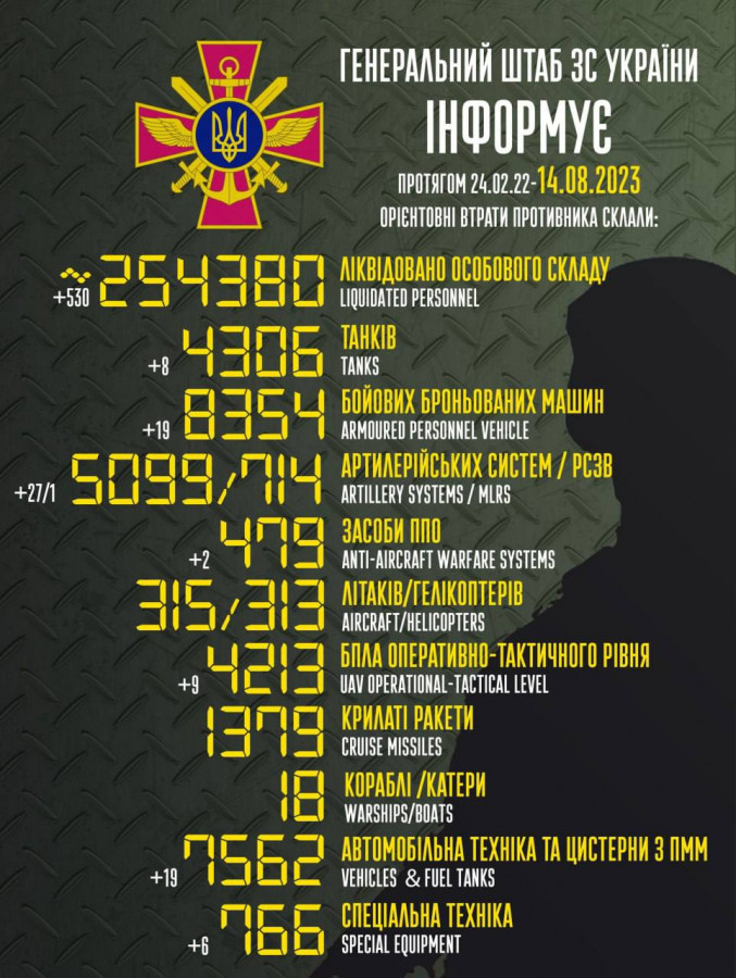 Загальні бойові втрати противника з 24.02.22 по 14.08.23 орієнтовно склали: