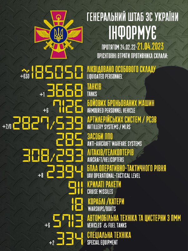 Загальні бойові втрати противника з 24.02.22 по 21.04.23 орієнтовно склали: