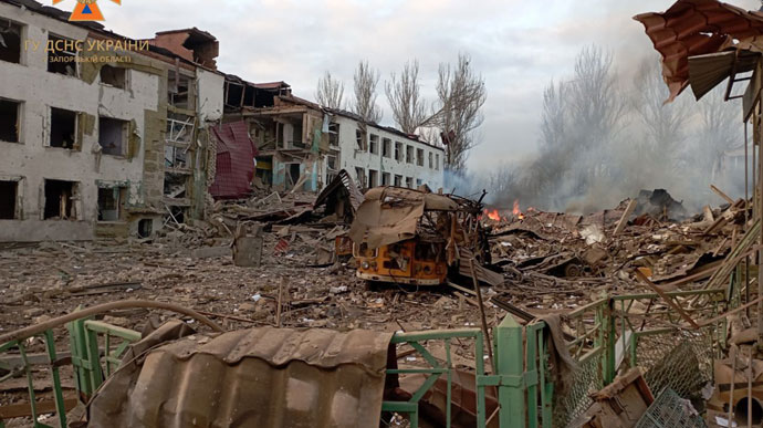 "3 квітня ворог здійснив авіаційний удар по одному з населених пунктів Пологівського району. У результаті цього сталося пошкодження двох корпусів навчального закладу та зруйновано тепловий перехід між спорудами з подальшим загоранням на загальній площі 100 кв.м. Пізніше ворог завдав повторного удару, який повністю зруйнував двоповерховий корпус гімназії", - йдеться у повідомленні.
