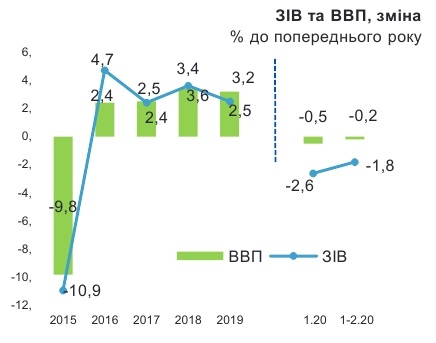 Відзначимо, в перший місяць 2020 року економіка України скоротилася на 0,5%. Негативна динаміка економіки в Україні зафіксована вперше з 2016 року.