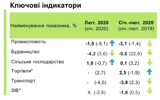 "За підсумками лютого скорочення економіки сповільнилося. Так, скорочення зведеного індексу виробництва (СІП) склало 1,8% проти 2,6% в січні. Це сталося внаслідок поліпшення в основних видах економічної діяльності, в тому числі, за рахунок додаткового дня в лютому 2020 року. зокрема, спостерігалося зростання у внутрішній торгівлі та с/г виробництві, скорочення падіння в промисловості і транспорті", - йдеться в повідомленні.