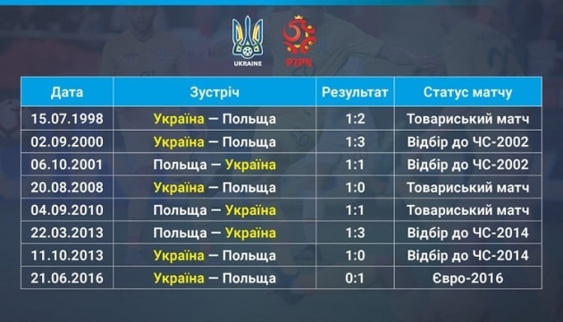 У відбіркових матчах чемпіонату світу Україна після поразки 2000-го (1:3 у Києві) та нічиєї 2001-го (1:1 у Хожуві) двічі виграла 2013-го (3:1 у Варшаві і 1:0 у Харкові).