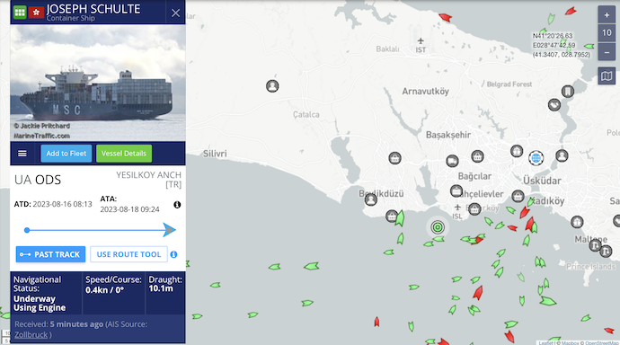 Спершу очевидець агентства зафіксував, як судно Joseph Schulte під прапором Гонконгу перетинає турецьку протоку Босфор.