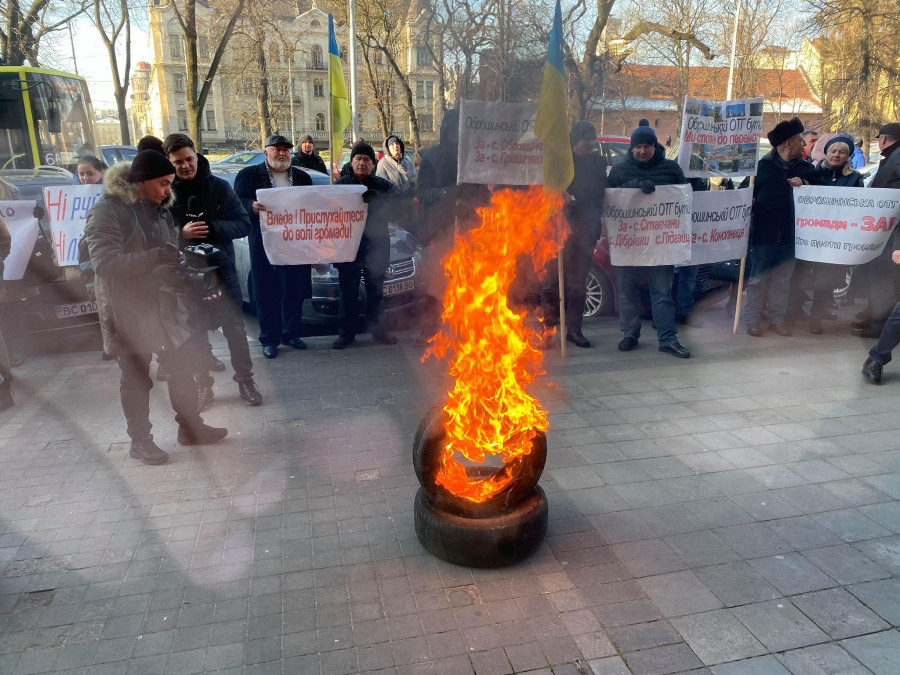 Під стінами ОДА зібралися кілька десятків учасників. Вони тримають плакати з гаслами: «Влада! Прислухайтеся до волі громади"; "Оброшинській ОТГ бути. За громади с. Ставчани, с. Дібрівки, с. Підгайці". "Оброшинській ОТГ бути. Ми стоїмо до перемоги".