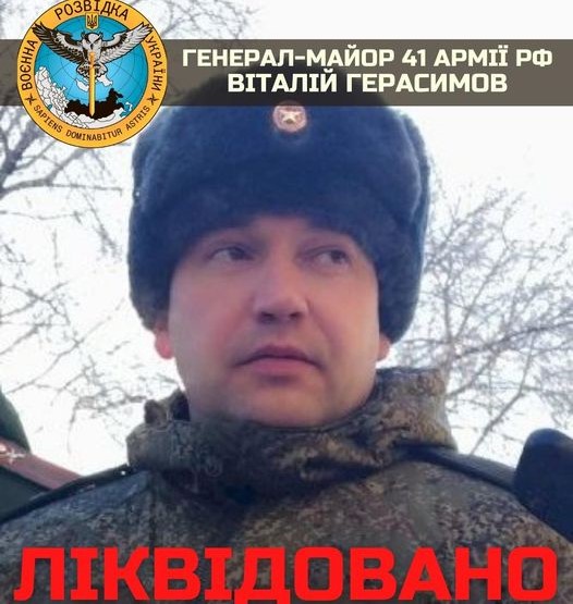 "Чергові втрати серед вищого командного складу армії країни-окупанта. Під час боїв поблизу Харкова ліквідовано Віталія Герасимова – російського воєначальника, генерал-майора, начальника штабу і першого заступника командувача 41 армії Центрального військового округу Росії. Також вбито та поранено низку старших офіцерів російської армії.