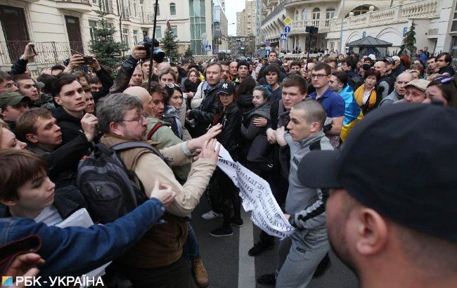 Під час мітингу під офісом Володимира Зеленського, кандидата в президенти України, сталася штовханина. Про це повідомляє кореспондент РБК-Україна.