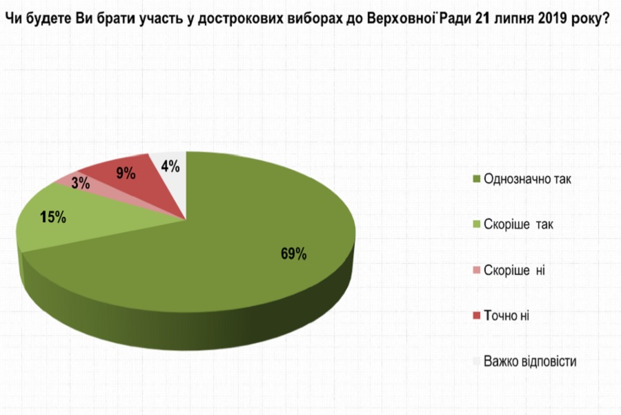 Згідно результатів опитування, проведеного Соціологічною групою «Рейтинг» протягом 6-9 червня 2019 року, 69% висловили однозначну готовність взяти участь у голосуванні на дострокових виборах до Верховної Ради 21 липня 2019 року. Ще 15% зазначили, що скоріше готові брати участь, 12% – не голосуватимуть, 4% – не визначилися.