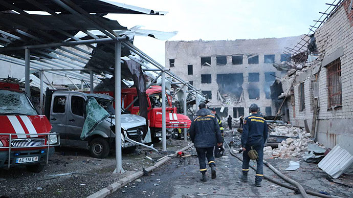 "Є поранені. Один із поранених - працівник ДСНС, тому що зруйновано і пошкоджено пожежну частину ДСНС у Дніпровському районі. Зараз цьому молодому чоловіку (йому 27 років) роблять операцію. Крім цього, є падіння залишків ракети та збитих дронів в Іларіонівській громаді Синельниківського району. Там пошкоджено і приватні домоволодіння, і п'ятиповерхові будинки, і там є семеро поранених, із них дві жінки зараз у лікарні, п'ятеро лікуються вдома амбулаторно", - сказав він на брифінгу в Медіацентрі "Україна - Укрінформ" у понеділок.