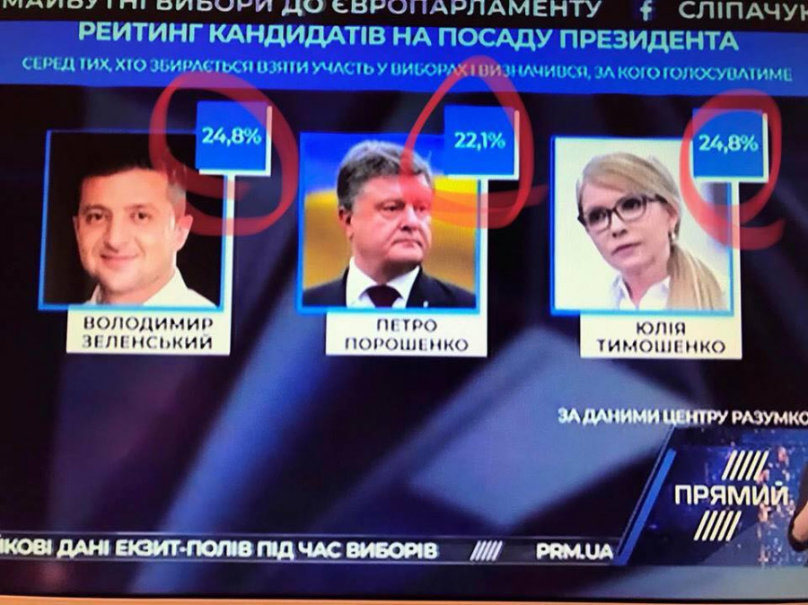 І ось вчора увечері на абсолютно пропрезидентському, а я б навіть сказав пропагандистському каналі «Прямий» лояльний до Порошенка журналіст Матвій Гонопольський оголошує, що згідно із соцопитуваннями, з великим відривом до другого туру виходять Зеленський та Порошенко, а в цей час на екрані показують зовсім інші цифри і результат.