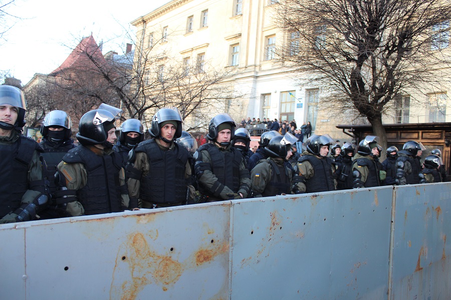 Проміжки між ними були перегороджені металевими щитами, за якими щільними лавами – у три-чотири ряди – вишикувались добряче призабуті у Львові «космонавти»: споряджені у максимальні обладунки бійці спецпідрозділів (5 - 6 взводів) та нацгвардійці. Окрім цього, усі перпендикулярні вулиці були перекриті ще грізнішими на вигляд заґратованими військовими вантажівками-автозаками, у кожну із принаймні чотирьох з яких за необхідності можна б було «упакувати» щонайменше півсотні затриманих. А перекритий ближче Опери турнікетами проспект «охороняли» (вочевидь, від потенційно не надто вдячних виборців) у дві лінії уздовж усього периметру вже нацгвардійці без спецспорядження та спецпризначенці біля рамок металошукачів, між якими курсували одягнені у цивільне службовці СБУ та УДО…