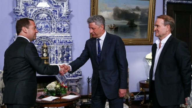 Доказом цього була постановочна сцена зустрічі в Москві пішака Фірташа – і за сумісництвом лідера фракції «Опозиційний блок» – Юрія Бойка з російським прем’єром Медведєвим і головою «Газпрому» Міллером, що відбулася в присутності Медведчука – відомого модератора комерційно-політичних стосунків Порошенка і Путіна.