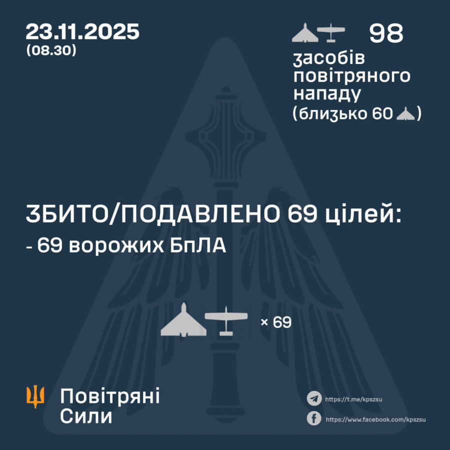 У ніч на 23 листопада Росія здійснила масовану атаку безпілотниками по території України, запустивши 98 ударних БПЛА різних типів — зокрема Shahed, «Гербер» та інші моделі. Про це повідомили Повітряні Сили Збройних Сил України.