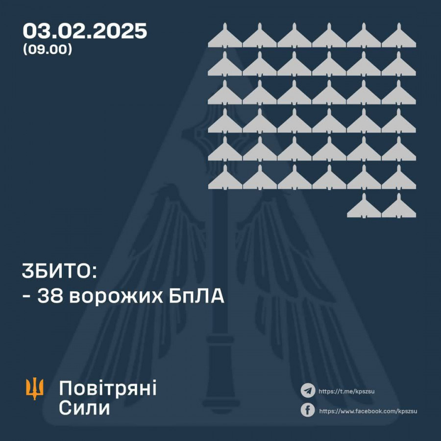 Дослівно: "Станом на 09.00 підтверджено збиття 38-ми ударних БпЛА типу Shahed та безпілотників інших типів у Харківській, Полтавській, Сумській, Київській, Чернігівській, Черкаській, Запорізькій, Дніпропетровській, Вінницькій та Хмельницькій областях. 25 ворожих безпілотників-імітаторів — локаційно втрачені (без негативних наслідків)".