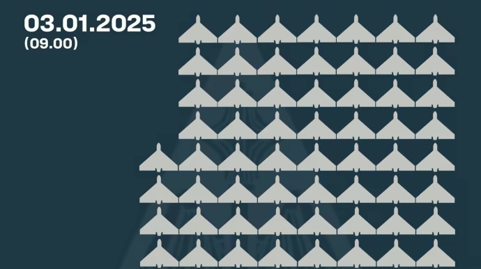 У ніч на 3 січня російські війська атакували Україну 93-ма ударними БпЛА типу Shahed і безпілотниками-імітаторами різних типів, Протиповітряна оборона знищила 60 "Шахедів", у двох областях зафіксовані влучання, на Київщині уламки пошкодили будинки та авто, одна людина загинула.