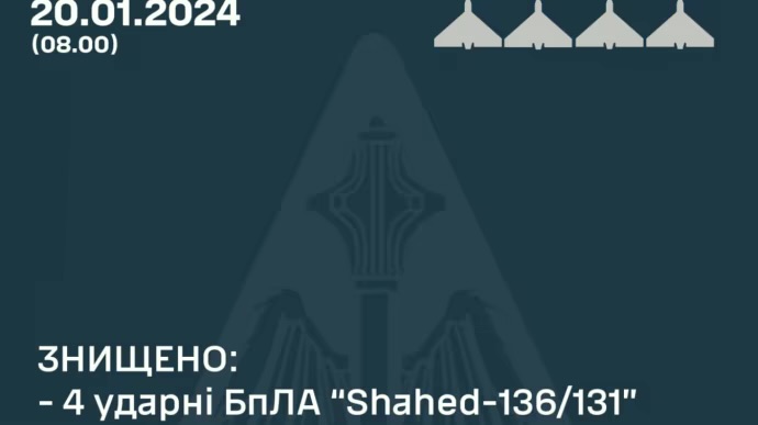 У ніч на 20 січня 2024 року окупанти атакували 7-ма ударними БпЛА типу Shahed-136/131 – з них чотири збиті силами ППО, а інші не досягли цілей.