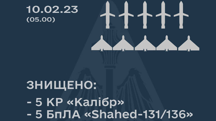 "10 лютого противник завдав ударів по містах та об’єктах критичної інфраструктури України. Силами та засобами Повітряних Сил ЗС України знищено 5 крилатих ракет "Калібр" та 5 ударних дронів "Shahed-136/131", – йдеться у повідомленні.