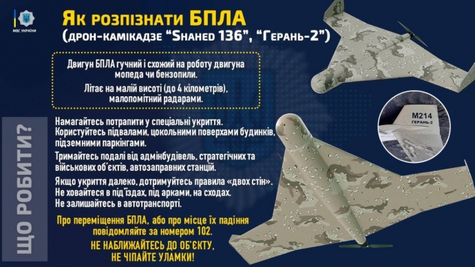 Правоохоронці поінформували, як розпізнати дрони-камікадзе "Shahed-136" та "Герань-2", і як повинні діяти громадяни у разі їхньої атаки.