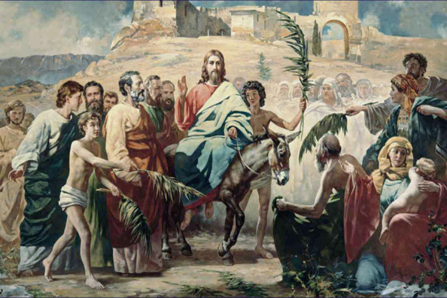 Народ Єрусалиму, знаючи про воскресіння Лазаря, зустрічає Ісуса дуже урочисто. Ісус, показуючи, що він входить до Єрусалиму з бажанням миру, а не війни, в'їжджає на ослі (на Сході в'їжджати в місто на ослі - символ миру, верхи на коні - символ війни).