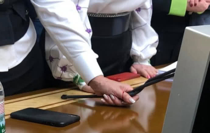 Раніше Тимошенко під час суперечки з колегами зламала мікрофон біля місця спікера і наразі співробітники апарату намагаються його відремонтувати. При цьому Тимошенко поранила до крові палець на руці.