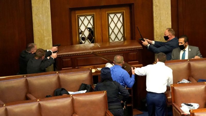 Фото - Охоронці Конгресу дістали зброї і ціляться убік дверей, які штурмували прихильники Трампа