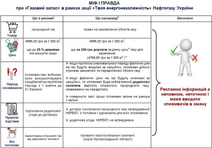 НАК "Нафтогаз України" не надає споживачам повної і точної інформації про ціну газу в рамках акції "Твоя енергонезалежність" по створенню газового запасу до опалювального сезону. Таким чином споживачі введені в оману.