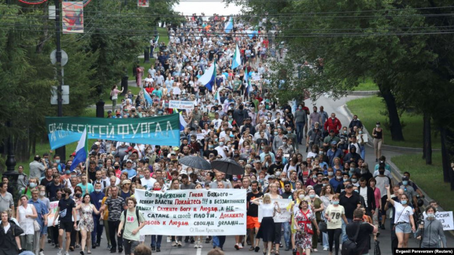 Чергова багатотисячна акція протесту відбулася в російському місті Хабаровську 8 серпня. Традиційними гаслами ходи і мітингу є необхідність повернути до Хабаровського краю затриманого правоохоронними органами популярного ексгубернатора Сергія Фургала. Разом із ними лунають заклики, які виходять за межі регіону, такі, як «Путіна у відставку!», «Путін – ворог народу!», «Нам потрібна підтримка всієї країни!» тощо.