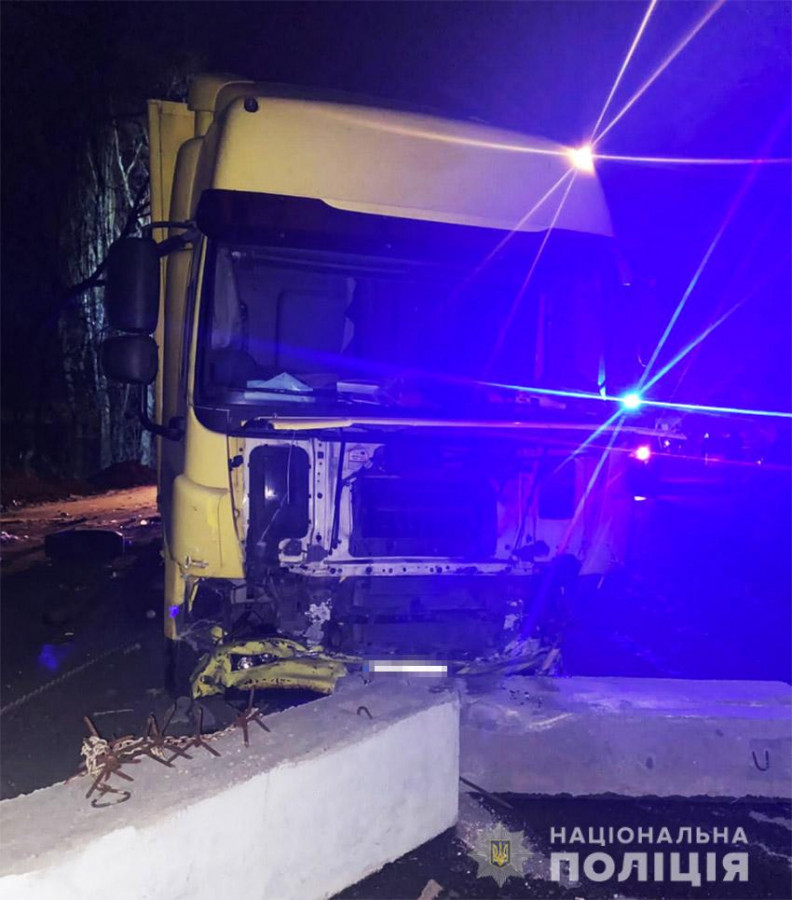 Як повідомляє прес-служба поліції Хмельницької області, аварія сталася ввечері середи, 13 квітня, на блокпосту поблизу Давидковецького перехрестя (виїзд з Хмельницького у бік Вінниці). Близько 21:15 у блокпост на швидкості в’їхала вантажівка DAF. За кермом фури перебував 28-річний мешканець Києва.