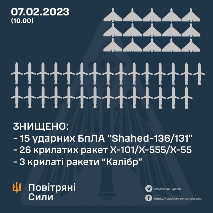 За інформацією Повітряних сил ЗСУ, на початку доби 7 лютого, ворог випустив по Україні:
