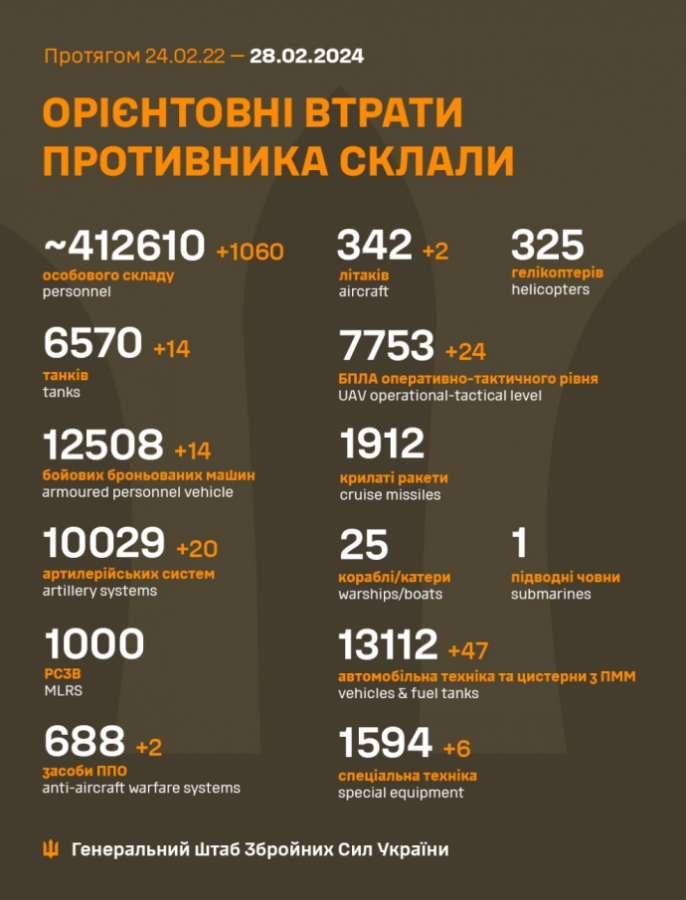 Загальні бойові втрати противника з 24.02.22 по 28.02.24 орієнтовно склали: