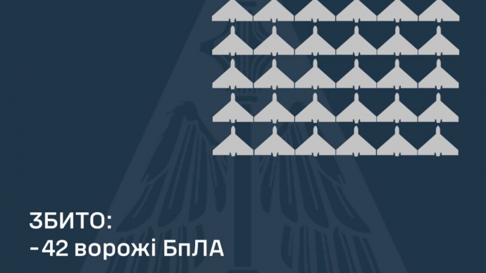 Дослівно ПС: "Станом на 09.00 підтверджено збиття 42 ударних БпЛА типу Shahed (безпілотників інших типів) на сході, півночі, півдні та в центрі країни.