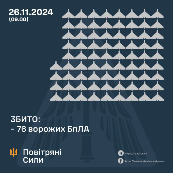 Вночі 26 листопада Росія здійснила рекордну атаку на Україну, використавши 188 ударних дронів типу Shahed та БпЛА невстановленого типу, а також 4 балістичні ракети "Іскандер-М".