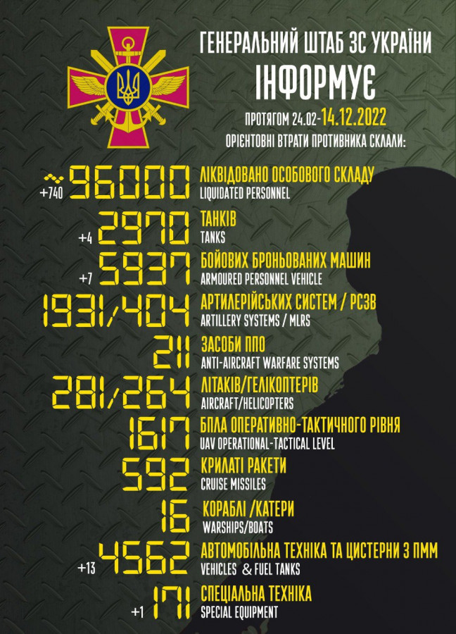 Загальні бойові втрати противника з 24.02 по 14.12 орієнтовно склали: