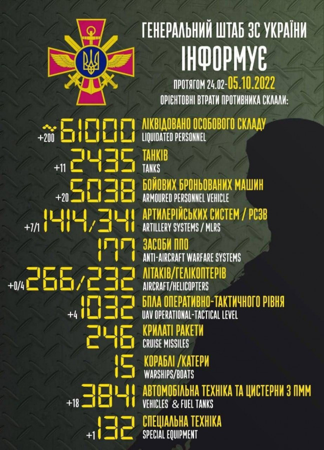 Загальні бойові втрати РФ із 24 лютого д 5 жовтня орієнтовно склали: