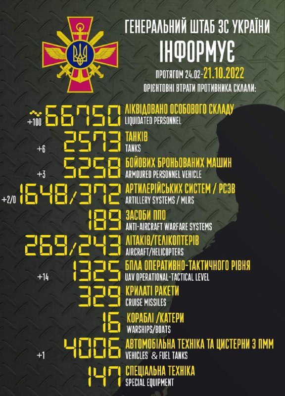 Загальні бойові втрати противника з 24.02 по 21.10 орієнтовно склали: