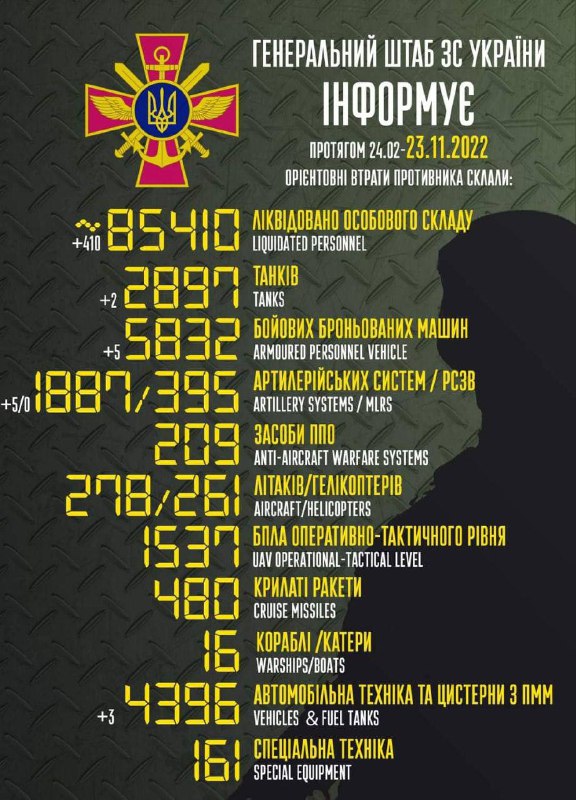 Такими є дані Генерального штабу ЗСУ станом на ранок середи, 23 листопада.