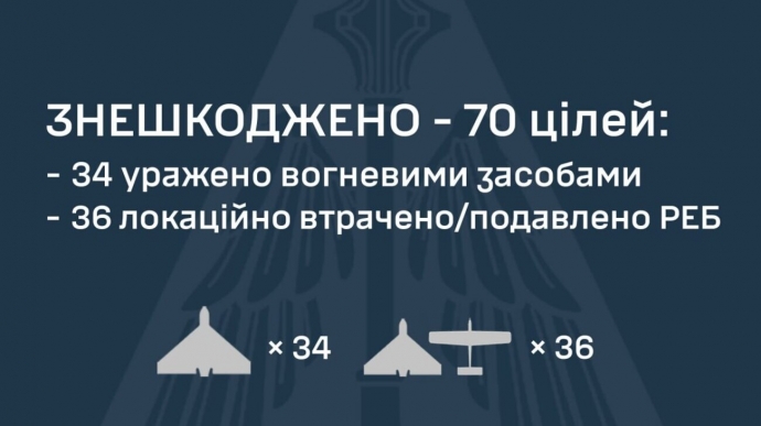 Дослівно: "Станом на 08.00 протиповітряною обороною знешкоджено 70 ворожих БпЛА типу Shahed (безпілотників інших типів) на півночі, сході та півдні країни. 34 – збито вогневими засобами ураження, 36 – локаційно втрачені/подавлені РЕБ.