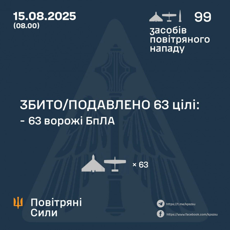 Дослівно ПС: "За попередніми даними, станом на 08.00, протиповітряною обороною збито/подавлено 63 ворожі БпЛА типу Shahed і дронів-імітаторів різних типів на півночі та сході країни. Зафіксовано влучання ракет та 34 БпЛА на 13 локаціях".