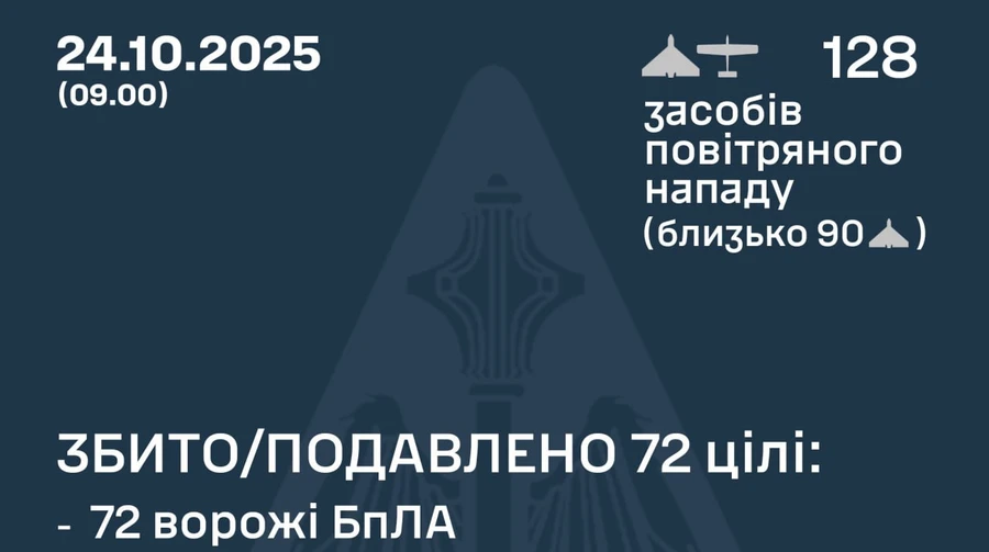 У ніч на 24 жовтня росіяни атакували 128 ударними БпЛА типу Shahed, "Гербера" і безпілотниками інших типів, близько 90 із них – "Шахеди".